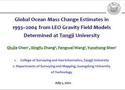 李博峰教授、沈云中教授、伍吉仓教授、李浩军教授、张磊教授、陈秋杰教授、杨玲副教授、梁鸿俞助理教授和部分研究生应邀参加了此次盛会。其中,陈秋杰老师做了题为“Global Ocean Mass Change Estimates in 1993~2004 from LEO Gravity Field Models Determined at Tongji University”的学术报告,入选为IAG 2021的高亮 (highlight)报告;杨玲老师做了题为“Quality Control of Outlier Detection,Identification and Adaptation in GNSS Positioning”的学术报告,分享了GNSS定位数据处理中的粗差探测与识别方法;梁鸿俞老师做了题目为“Estimation and Correction of Error Sources in MTInSAR”的报告,汇报了MTInSAR误差源的估计与改正方法;王奉伟博士做了题为“Quantitative Analysis of Global Sea-Level Budget Based on GRACE, Satellite Altimetry and Argo Observations”的报告,联合GRACE重力卫星数据和测高数据对海平面变化进行了量化分析。