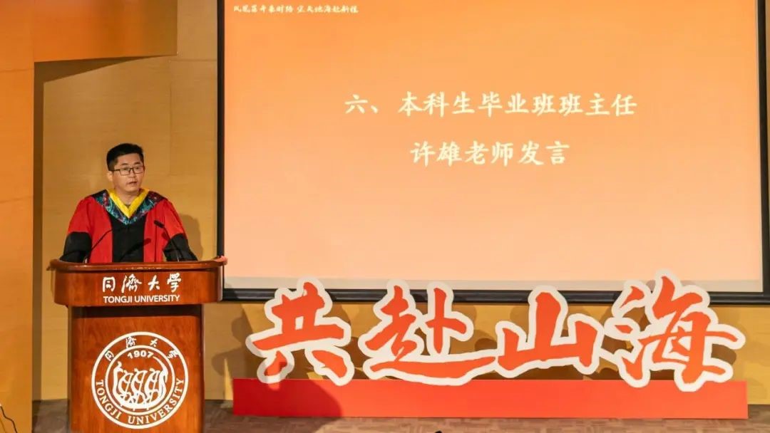 本科生毕业班班主任许雄老师发言。许老师谈到,这是最后一次以班主任的身份与大家畅聊未来,并带领大家共同回顾四年间并肩作战的日日夜夜。许老师对大家充满信任和期待,寄语毕业生要做懂得学习的人,只有懂得学习,才能将人生导航到正确的方向;要做懂得感恩的人,在力所能及时回馈社会,真正做到“达则兼济天下”;要做品德高尚的人,对社会有价值,传递正能量,“勿以善小而不为,勿以恶小而为之”。