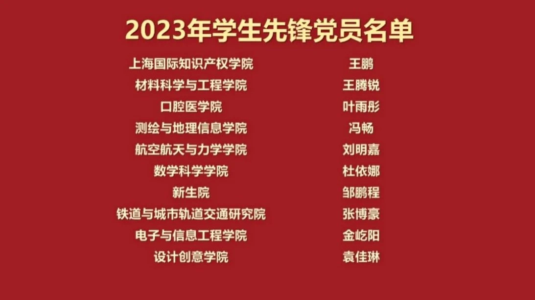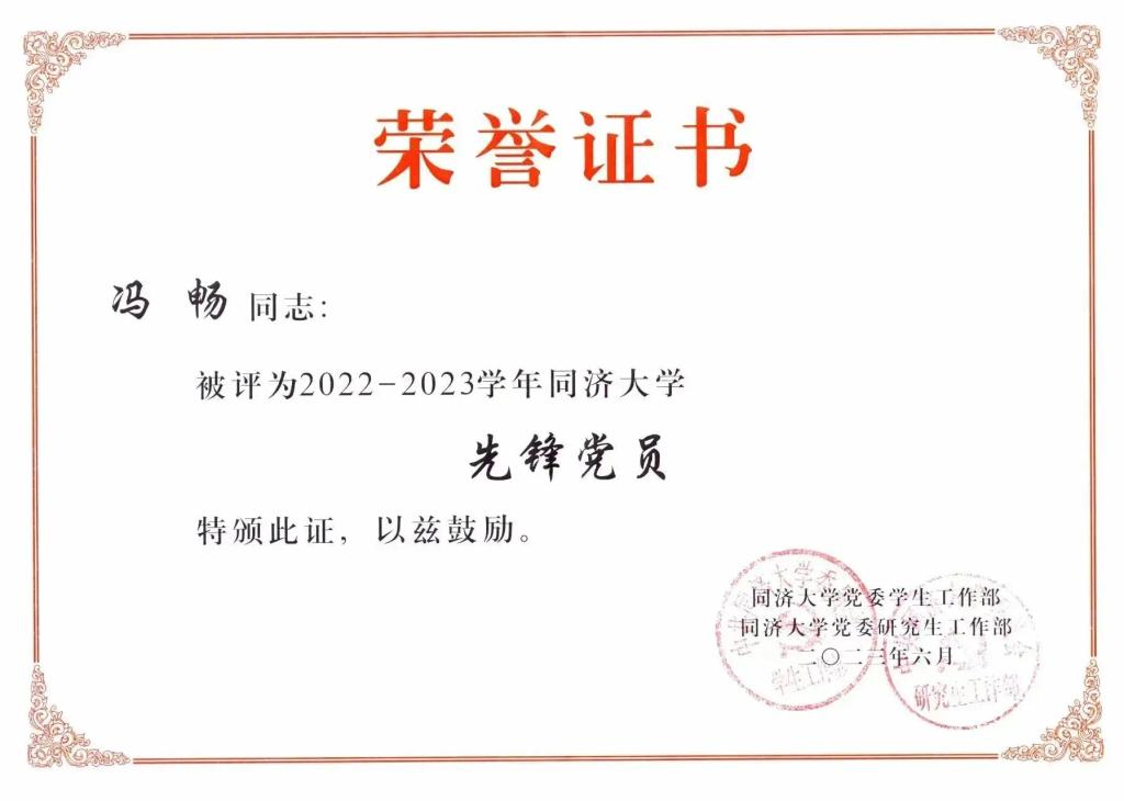学生党员、2021级硕士研究生冯畅获评2022-2023学年同济大学先锋党员。