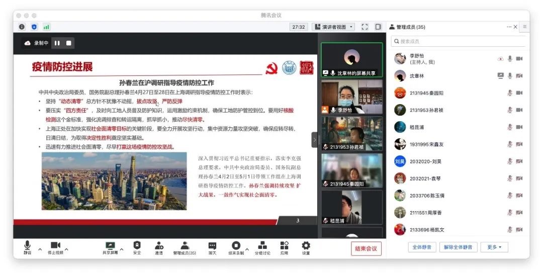 2021级研究生党员沈章林和袁雷童带领支部党员们共同学习中共中央政治局常务委员会关于“分析新冠肺炎疫情形势 部署从严抓好疫情防控工作”的会议内容。