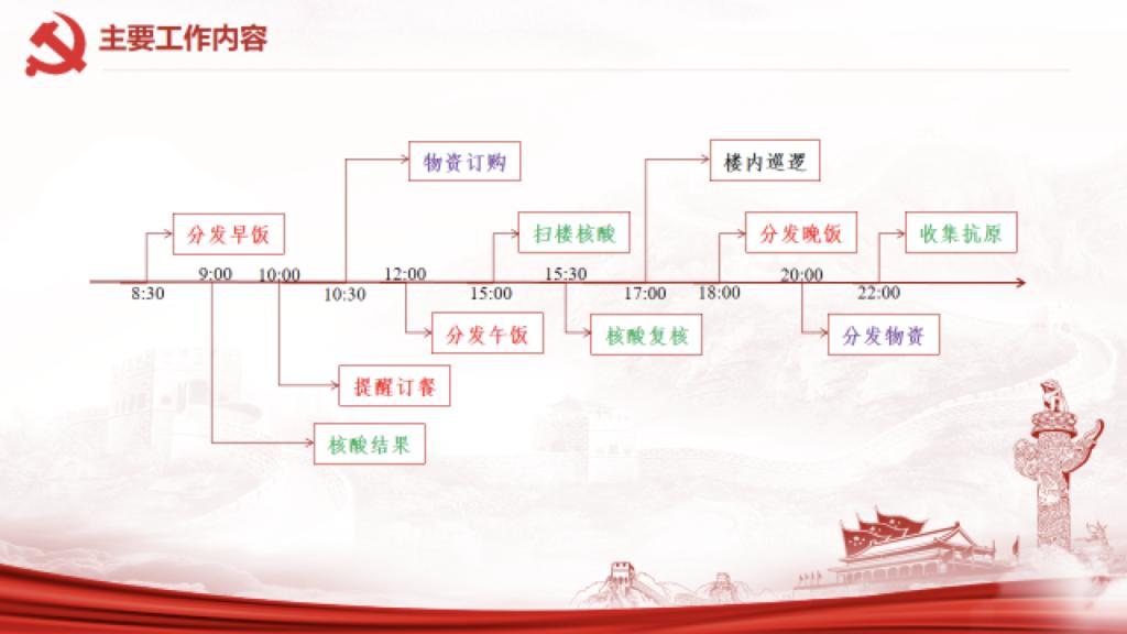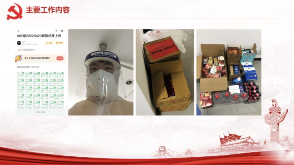 在这个板块中,2020级研究生党员李鹏远分享了他作为层长的一天。学生层长在这次疫情防控中发挥了非常重要的作用。李鹏远同学一直担任彰武6号楼第2层层长,他按时间顺序和大家分享了层长一天的工作。从早上八点半到晚上十点,他需要完成早中晚饭的分发、核酸和抗原结果的收集审核以及楼内巡逻、物资发放相关事宜。这些事项分散在一天里,几乎每隔一个半小时,就有一项事务等待处理。这样的情况下对他本人的科研任务造成了一定影响,而李鹏远仍旧优先履行层长义务,他用自己实际行动响应着“是党员就要站出来”的号召。