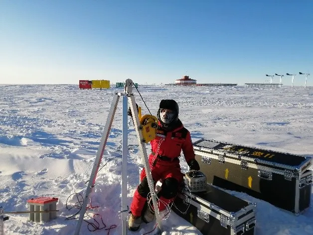 (乔刚老师使用GPS、全站仪在冰盖进行测绘工作)