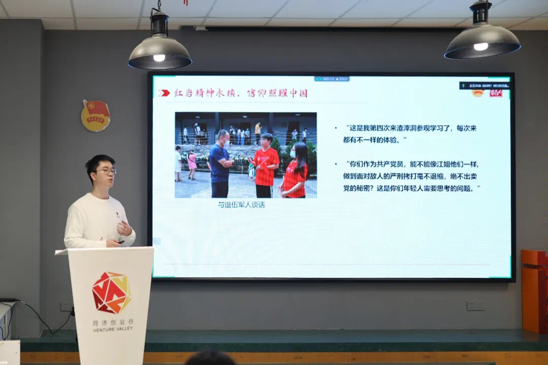 2021级硕士研究生曾浩峰,是同济大学红色大课堂学生党员暑期实践活动的一员。曾浩峰首先与大家分享了在渣滓洞开展实践时,与现场一位退伍军人交流的问题:“你们能不能像江姐他们一样,做到面对敌人的严刑拷打时毫不退缩,绝不出卖党的秘密?”这也使他联想到了网络上的另一个讨论:“我们这一代年轻人,还有不计生死的血性吗?”