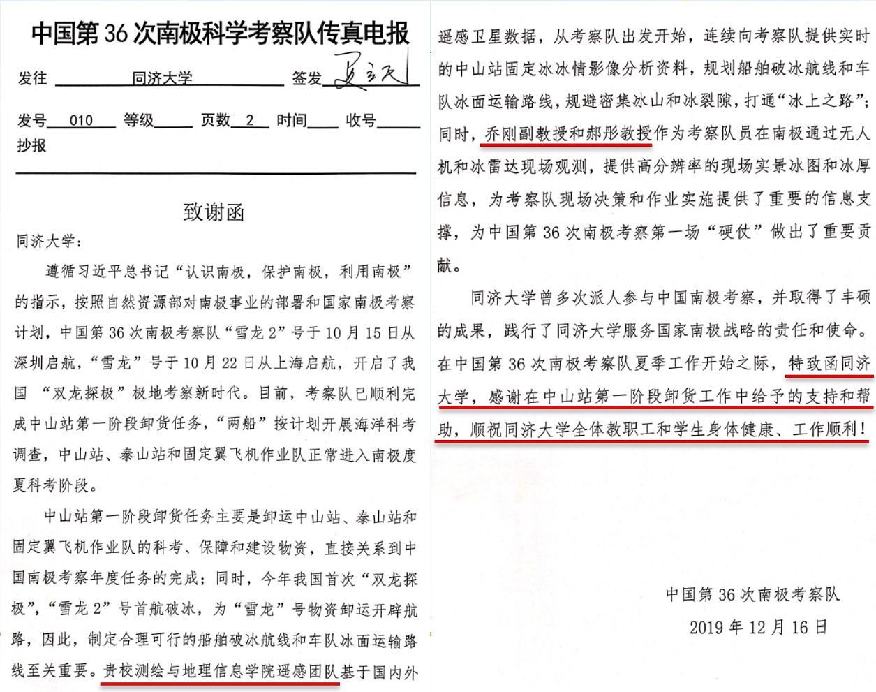 5. 极地科学考察 1)乔刚教授参加中国第35、36次南极科学考察 乔刚教授于2018-2020年间参加中国第35、36次南极科学考察,服务于国家南极战略和极地科普事业。第36次南极科学考察中山站卸货期间,依托足球角球比分 遥感团队为雪龙船规划破冰航线和冰面运输路线提供技术支撑并做出了重要贡献,考察队专门致函感谢同济大学的支持,本人被中国第36次南极考察队授予“优秀党员”称号。同济大学官网、人民日报海外版、搜狐网、澎湃新闻等新闻媒体对南极科考活动进行了广泛报道,获得了公众的广泛关注。